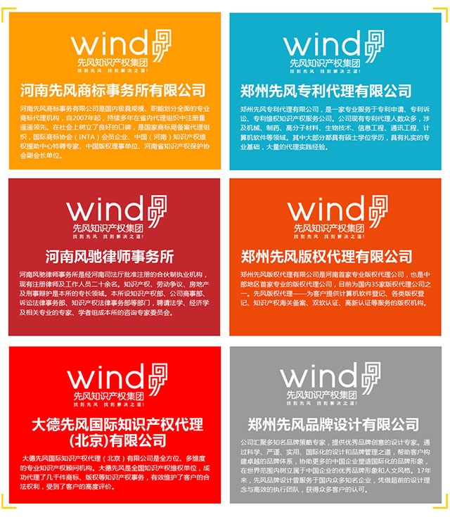2003年,先風(fēng)創(chuàng)立,十余年的勵精圖治,先風(fēng)已發(fā)展成為由河南先風(fēng)商標(biāo)事務(wù)所有限公司、鄭州先風(fēng)專利代理有限公司、河南風(fēng)馳律師事務(wù)所、鄭州先風(fēng)版權(quán)代理有限公司、大德先風(fēng)國際知識產(chǎn)權(quán)代理(北京)有限公司、鄭州先風(fēng)品牌設(shè)計有限公司等組成的以品牌創(chuàng)造與技術(shù)保護為產(chǎn)業(yè)鏈的綜合型企業(yè),成為中原地區(qū)能夠提供專業(yè)知識產(chǎn)權(quán)綜合服務(wù)的集團機構(gòu)。