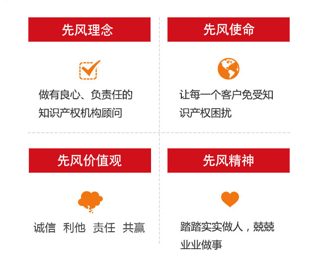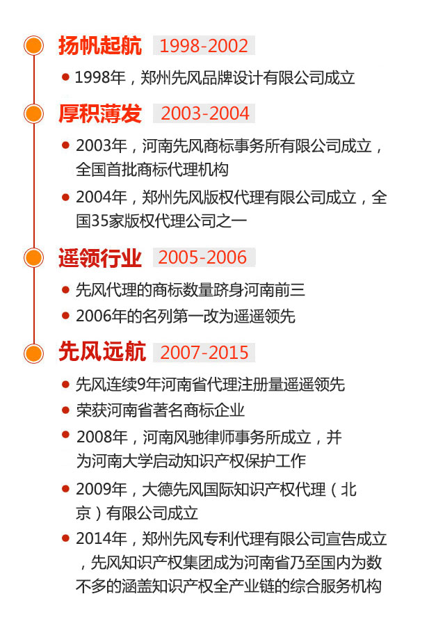 2003年,先風(fēng)創(chuàng)立,十余年的勵精圖治,先風(fēng)已發(fā)展成為由河南先風(fēng)商標(biāo)事務(wù)所有限公司、鄭州先風(fēng)專利代理有限公司、河南風(fēng)馳律師事務(wù)所、鄭州先風(fēng)版權(quán)代理有限公司、大德先風(fēng)國際知識產(chǎn)權(quán)代理(北京)有限公司、鄭州先風(fēng)品牌設(shè)計有限公司等組成的以品牌創(chuàng)造與技術(shù)保護為產(chǎn)業(yè)鏈的綜合型企業(yè),成為中原地區(qū)能夠提供專業(yè)知識產(chǎn)權(quán)綜合服務(wù)的集團機構(gòu)。